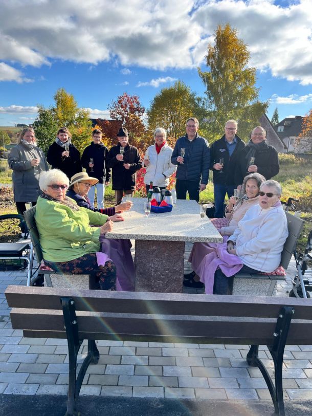 Dank des Engagements mehrerer Beteiligter konnte dieser Wunsch nun erfüllt werden. Die Firma Jens Kraus fertigte und spendete einen Tisch sowie zwei Bänke aus Granit, der OGV Großschloppen unterstützte das Projekt finanziell. Der Bauhof der Stadt übernahm die Pflasterung und sorgte dafür, dass die Fläche barrierefrei zugänglich ist – auch für Menschen mit Rollator oder Rollstuhl. Die neue Sitzgelegenheit liegt direkt am Radweg und am Kartoffellehrpfad – ein Ort, der künftig nicht nur den Bewohnerinnen und Bewohnern des BeneVits, sondern auch Spaziergängern, Radfahrern und Ausflüglern eine willkommene Pause bietet.