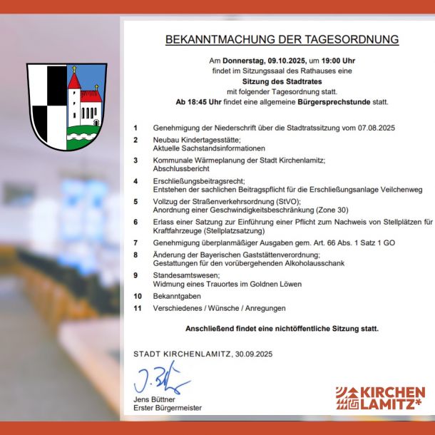 Aktuelles Tagesordnung der Stadtratssitzung am 09.10.2025 06. Oktober 2025 Am Donnerstag, 09.10.2025 findet eine Stadtratssitzung statt. Beginn der öffentlichen Sitzung ist um 19.00 Uhr im Sitzungssaal des Rathauses in Kirchenlamitz. Die Themen finden Sie in der Tagesordnung !