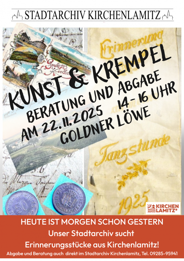 Parallel dazu läuft die Kunst & Krempel-Aktion „Heute ist morgen schon gestern“, bei der die Kirchenlamitzer Bürgerinnen und Bürger gebeten sind, alte oder neue Gegenstände mit Bezug zu Kirchenlamitz dem Archiv zur Verfügung zu stellen.