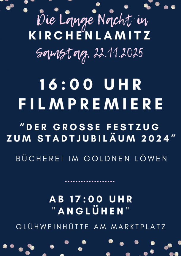 Um 16:00 Uhr beginnt die „Lange Nacht“ mit einer Filmpremiere in der Bücherei des Goldnen Löwen: Gezeigt wird „Der Festzug zum Stadtjubiläum 2024“.