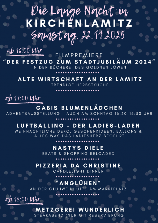 An diesem Abend öffnen zahlreiche Geschäfte und Gaststätten ihre Türen – mit dabei sind u.a. die Alte Wirtschaft an der Lamitz mit trendiger Herbstküche, Gabis Blumenlädchen mit Adventsausstellung, Luftballino mit weihnachtlicher Deko, Nastys Diele mit DJ-Beats & Second-Hand-Shopping, die Pizzeria da Christine mit Candlelight Dinner sowie die Metzgerei Wunderlich mit Steakabend (nur mit Reservierung).