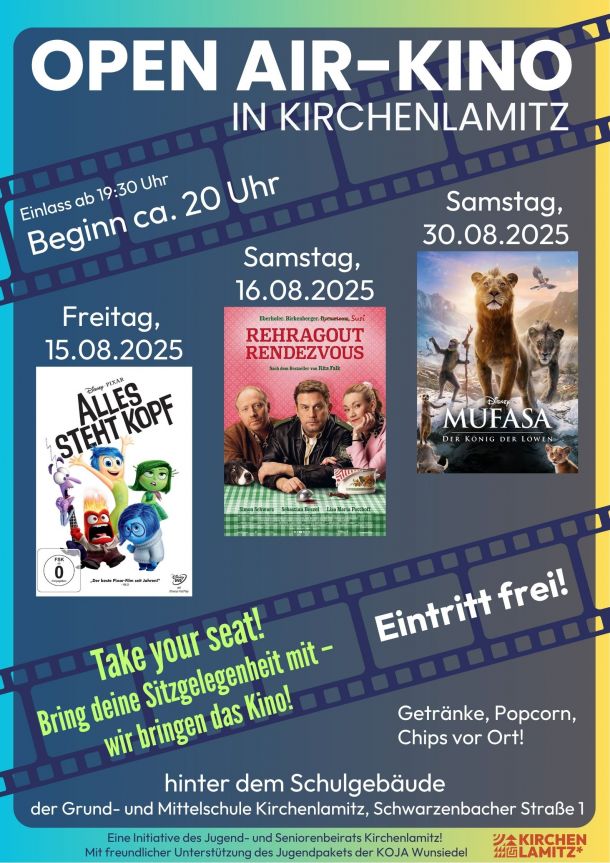 Im August verwandelt sich Kirchenlamitz in ein ganz besonderes Freiluftkino: Möglich macht das ein generationsübergreifendes Projekt von Jugend- und Seniorenbeirat Kirchenlamitz, das durch das Jugendpaket der Kommunalen Jugendarbeit Wunsiedel finanziert wird. Die stellvertretende Jugendbeiratsvorsitzende Annalena Gareiß stellte die Idee im März im Jugendausschuss vor und erhielt dafür einen Zuschuss – nun können in diesem Sommer gleich drei Filme unter freiem Himmel gezeigt werden.