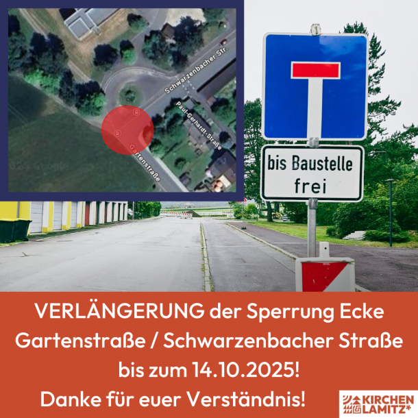 Wir möchten Sie informieren, dass die Vollsperrung an der Ecke Schwarzenbacher Straße/Gartenstraße voraussichtlich bis zum 14. Oktober 2025 bestehen bleibt. Die Tiefbauarbeiten, die während der Sommerferien begonnen wurden, dauern weiterhin an.