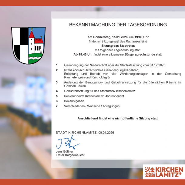 Aktuelles Tagesordnung der Stadtratssitzung am 15.01.2026 12. Januar 2026 Am Donnerstag, 15.01.2026 findet die erste Stadtratssitzung im neuen Jahr statt. Beginn der öffentlichen Sitzung ist um 19.00 Uhr im Sitzungssaal des Rathauses in Kirchenlamitz. Vor der Sitzung wird eine Bürgerfragestunde angeboten, diese beginnt um 18:45 Uhr. Die Themen der Stadtratssitzung finden Sie in der Tagesordnung unter diesem Beitrag.
