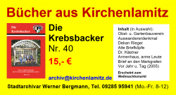 Die Schriftenreihe "Die Krebsbacker" wird jährlich vom Archiv der Stadt Kirchenlamitz herausgegeben. Mit dem Erwerb der Chronik erhält man im Laufe der Zeit eine umfassende Chronik von Kirchenlamitz und seiner Umgebung.